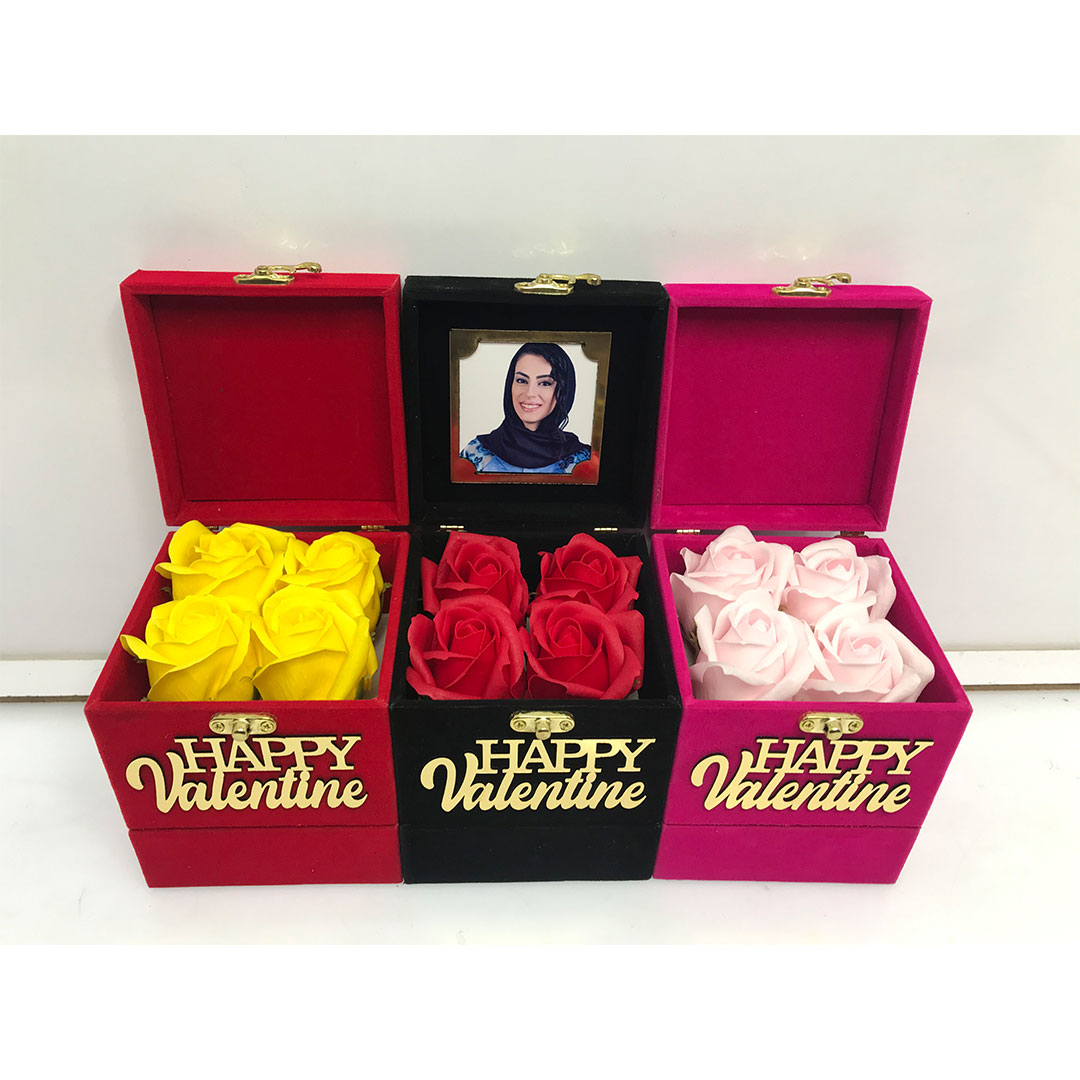 محتویات رزباکس : گل رز ، عکس در ابعاد 6-6 و 3 پلاک شامل: نام ،تاریخ و متنِ مد نظر شما